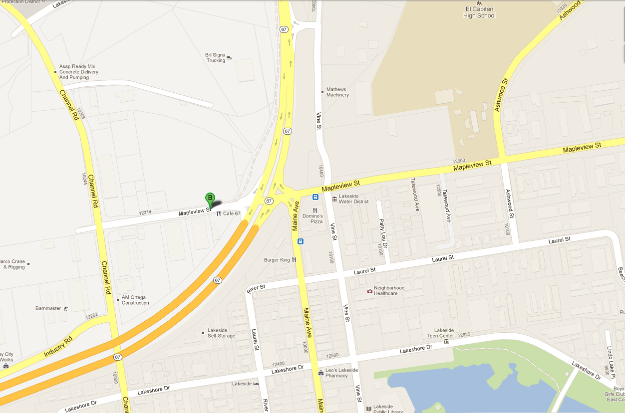 We are Cafe 67, conveniently located at the traffic light at 12381 Mapleview Street and Highway 67 in Lakeside, California, 92040 USA (San Diego County).